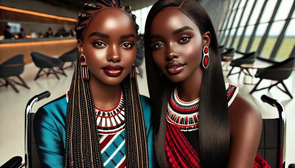 These two friends sit side-by-side, radiating elegance and unity through their vibrant traditional adornments and confident presence. Their poised expressions, intricate hairstyles, and beautifully coordinated attire highlight a friendship rooted in strength, culture, and mutual support. This portrait captures both grace and connection in a modern, sophisticated setting.