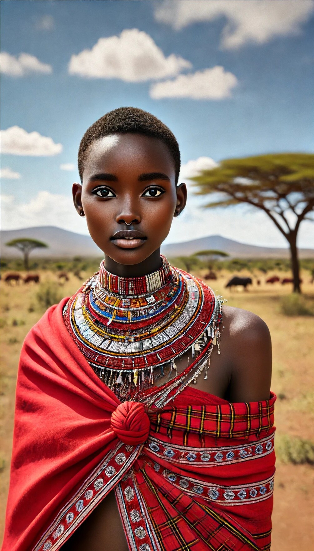 This breathtaking portrait captures the quiet power and regal beauty of a young Maasai woman wrapped in vibrant red shúkà cloth and adorned with master-crafted beadwork.