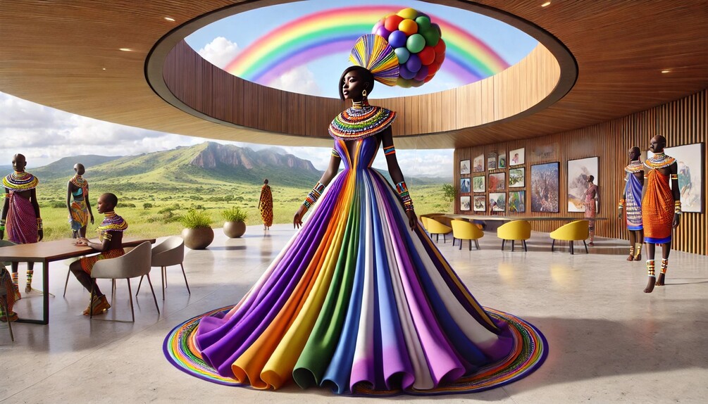This masterpiece blends futurism with cultural elegance, portraying a queen-like figure draped in a radiant rainbow gown that symbolizes unity, pride, and limitless creativity. Set inside a modern art pavilion overlooking lush African landscapes, the scene celebrates heritage, innovation, and the beauty of collective imagination. A striking harmony of color, architecture, and identity.