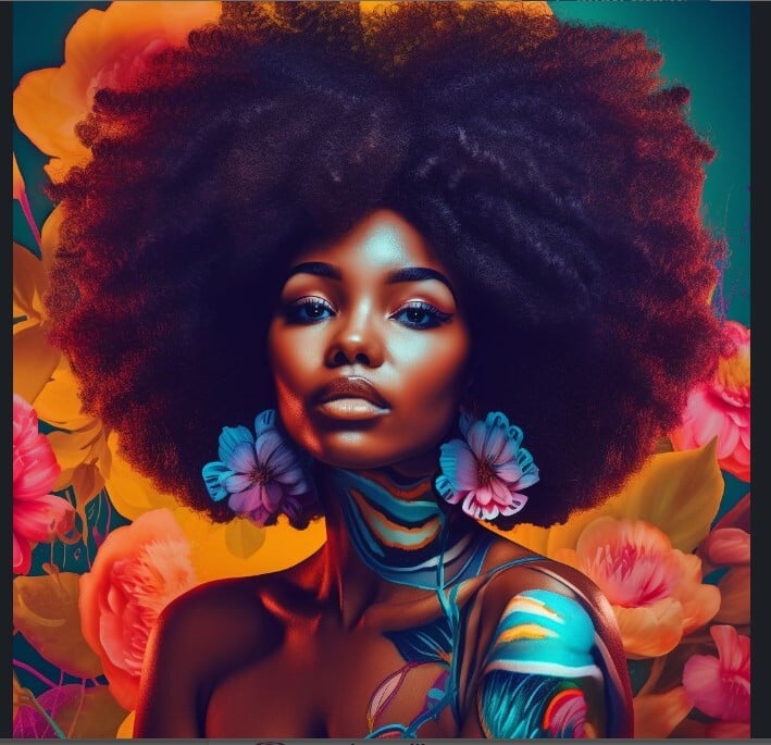 Step into a world of bold color and striking beauty with this Afro-futuristic portrait featuring a powerful Black woman surrounded by lush, dreamlike florals. Her radiant skin, voluminous natural afro, and vivid body art create a masterpiece that blends culture, elegance, and artistic fantasy. Perfect for collectors who love vibrant, high-impact visual art that celebrates Black beauty, creativity, and strength.