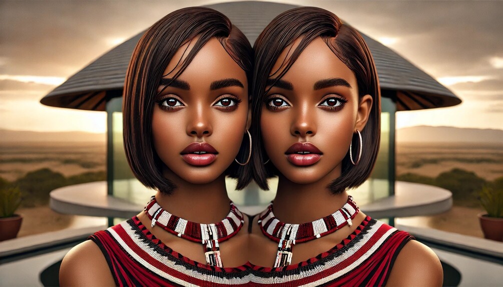 This ultra-detailed digital artwork features two identical young Black women standing side by side, their poised expressions and flawless melanin-rich skin framed by sleek bobs and sunset lighting. Their Maasai-inspired beadwork collars and earrings echo one another perfectly, symbolizing self-awareness, inner dialogue, and the power of how we see ourselves—and others.