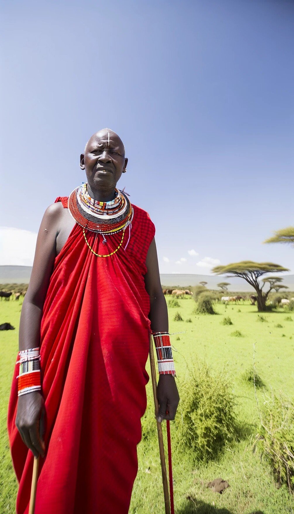 This powerful full-body portrait captures the dignity, strength, and ancestral presence of a Maasai elder standing proudly beneath the open African sky. His posture tells a story of endurance. His adornments reflect generations of tradition. His expression carries decades of wisdom, courage, and leadership.