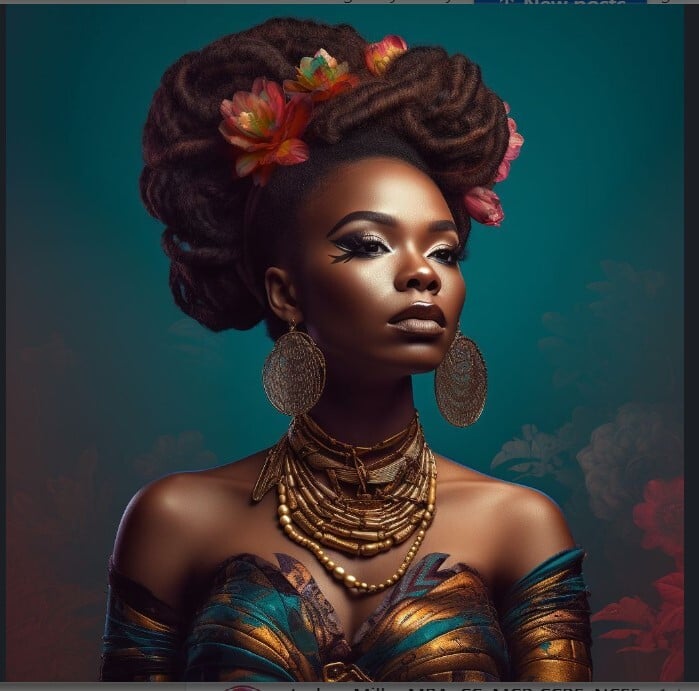 Step into a world of royal elegance with this Afro-futurist masterpiece — a stunning portrait capturing the power, poise, and divine presence of a modern African queen. Every detail radiates strength: the towering dreadlock crown adorned with vibrant blossoms, the luminous skin glow, the gold-accented jewelry, and the deep teal floral backdrop that breathes life into the entire scene.