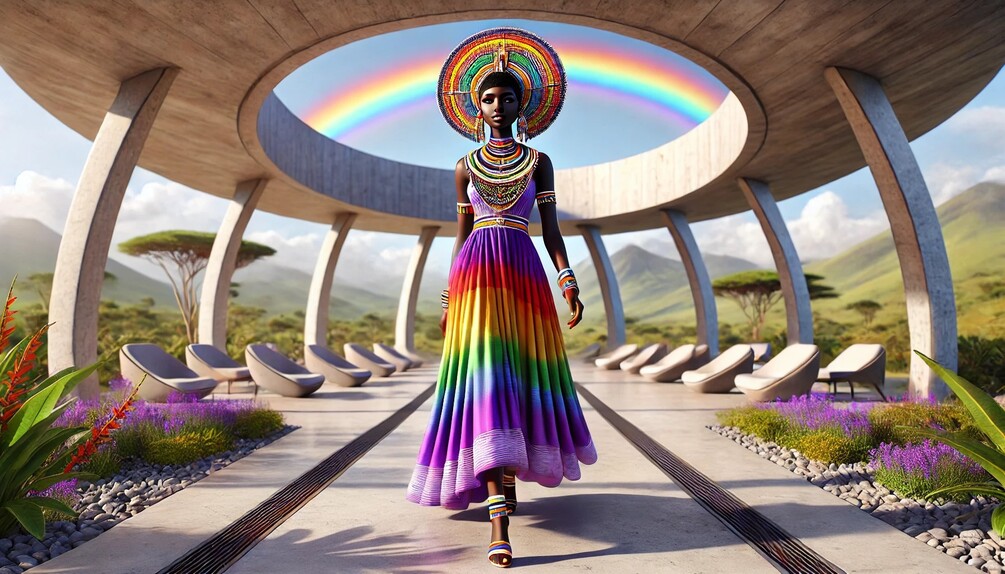 A radiant figure steps forward with calm authority, framed by an open-air architectural ring and a vibrant rainbow arching perfectly above her. Her flowing multicolor dress echoes the landscape’s harmony and the fusion of culture, elegance, and futurism. This piece symbolizes upliftment, clarity, and the rising strength of creative identity.