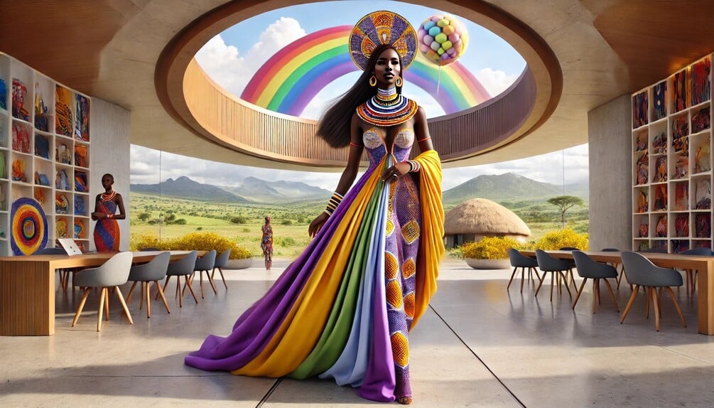 A radiant queen stands at the center of a modern gallery, draped in a flowing spectrum gown that merges ancestral heritage with futuristic elegance. The surrounding art, the open circular skylight, and the sweeping African landscape create a perfect harmony between culture, color, and innovation. This piece captures the spirit of imagination, pride, and limitless possibility.
