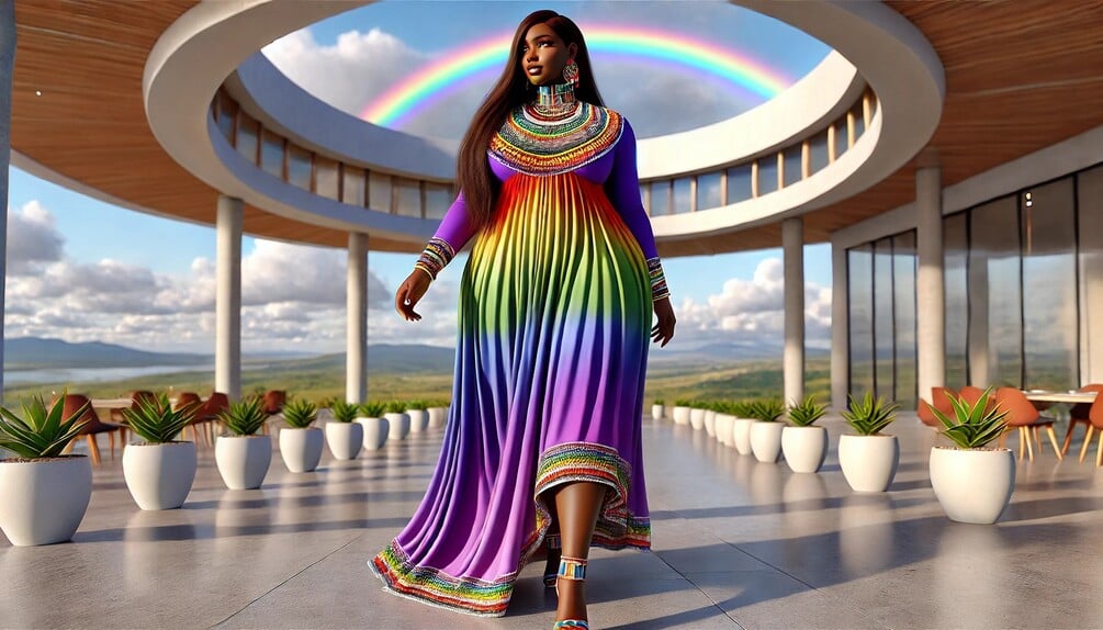 This captivating piece portrays a regal figure walking with serene confidence beneath a perfect rainbow halo. Her flowing spectrum dress and intricate beadwork merge ancestral artistry with modern elegance, symbolizing harmony, pride, and limitless creativity