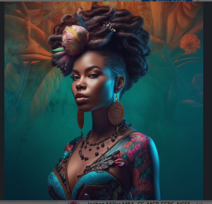 Step into a world of vibrant fantasy and royal elegance with this stunning Afro-futurist portrait. Poised, powerful, and beautifully adorned, she stands against a lush, cinematic backdrop that blends nature, culture, and modern artistry. From the intricate loc crown wrapped in florals to the ornate jewelry, textured fabrics, and glowing teal-orange lighting, every detail creates a premium collectible artwork that feels alive. Perfect for creatives, designers, décor lovers, and anyone who appreciates Black beauty reimagined in a bold, art-forward style.