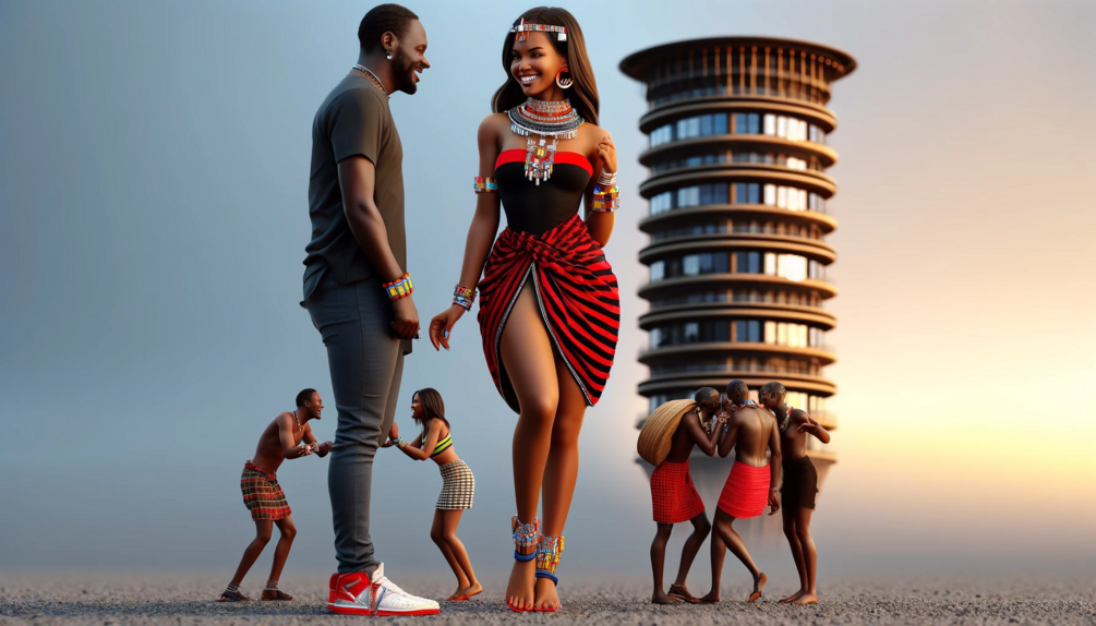 Celebrate the beauty, strength, and joy of Kenyan culture with this stunning ultra-HD artwork. This vibrant scene captures a smiling couple in modern African-inspired fashion, surrounded by traditional dancers and the iconic leaning tower landmark in the background. Every detail—from the beadwork and textiles to the soft evening light—creates a powerful expression of heritage, love, and identity.